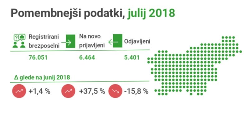 Ob koncu julija 2018 je bilo registriranih 76.051 brezposelnih, kar je 1.063 oseb oziroma 1,4 % več kot junija in 10,2 % manj kot julija 2017.