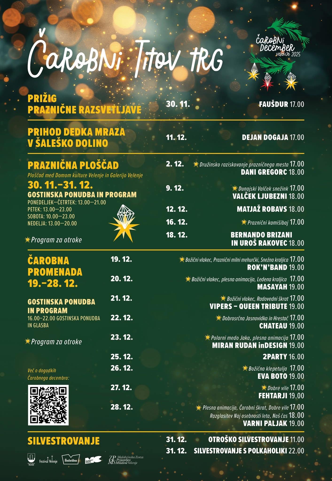 Koncertno dogajanje na Titovem trgu bodo odprli Rok’n’Band (19. 12.), sledil bo koncert Masayah (20. 12.), zabavali vas bodo tudi Vipers – Queen tribute (21. 12.), domači bend Chateau (22. 12.) in Miran Rudan s skupino inDESIGN (23. 12.). Na Božič bo za glasbo poskrbel 2 Party (25. 12.), sledil bo koncert Eve Boto (26. 12.), veselica s skupino Fehtarji (27. 12.), koncertni sklop Čarobne promenade pa bo zaključila domača zasedba Varni Paljak (28. 12.). Druženje na dogodkih na Titovem trgu bo pospremila gostinska ponudba v prijetnem ambientu in spremljevalno dogajanje v otroškem kotičku, ki bo pričaral raznovrstna in zanimiva presenečenje za najmlajše. Tukaj bodo lahko otroci srečali dobre vile in škrate, občudovali pravljična bitja na hoduljah, se iz oči v oči pogovarjali s Snežno kraljico, plesali svetlobni ples, pisali pisma Dedku Mrazu, se morda zapeljali z božičnim vlakcem in še kaj.