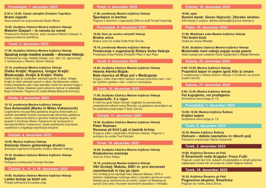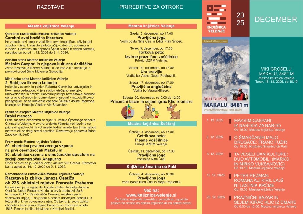Knjižnica Velenje je v december vstopila z razgibanim programom, ki prinaša preplet kulturno, izobraževalno, umetniško in praznično obarvanih dogodkov. Vse od literarnih srečanj in razstav do prazničnega bazarja in večerov s posebnimi gosti, med katerimi tokrat izstopa izjemni alpinist Viki Grošelj.