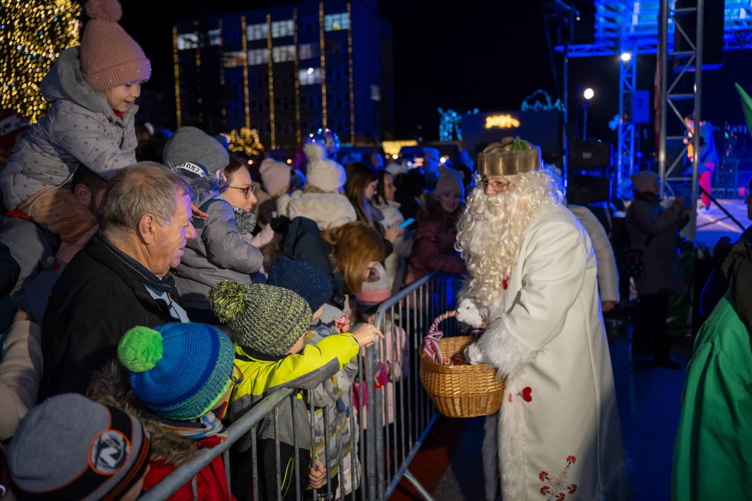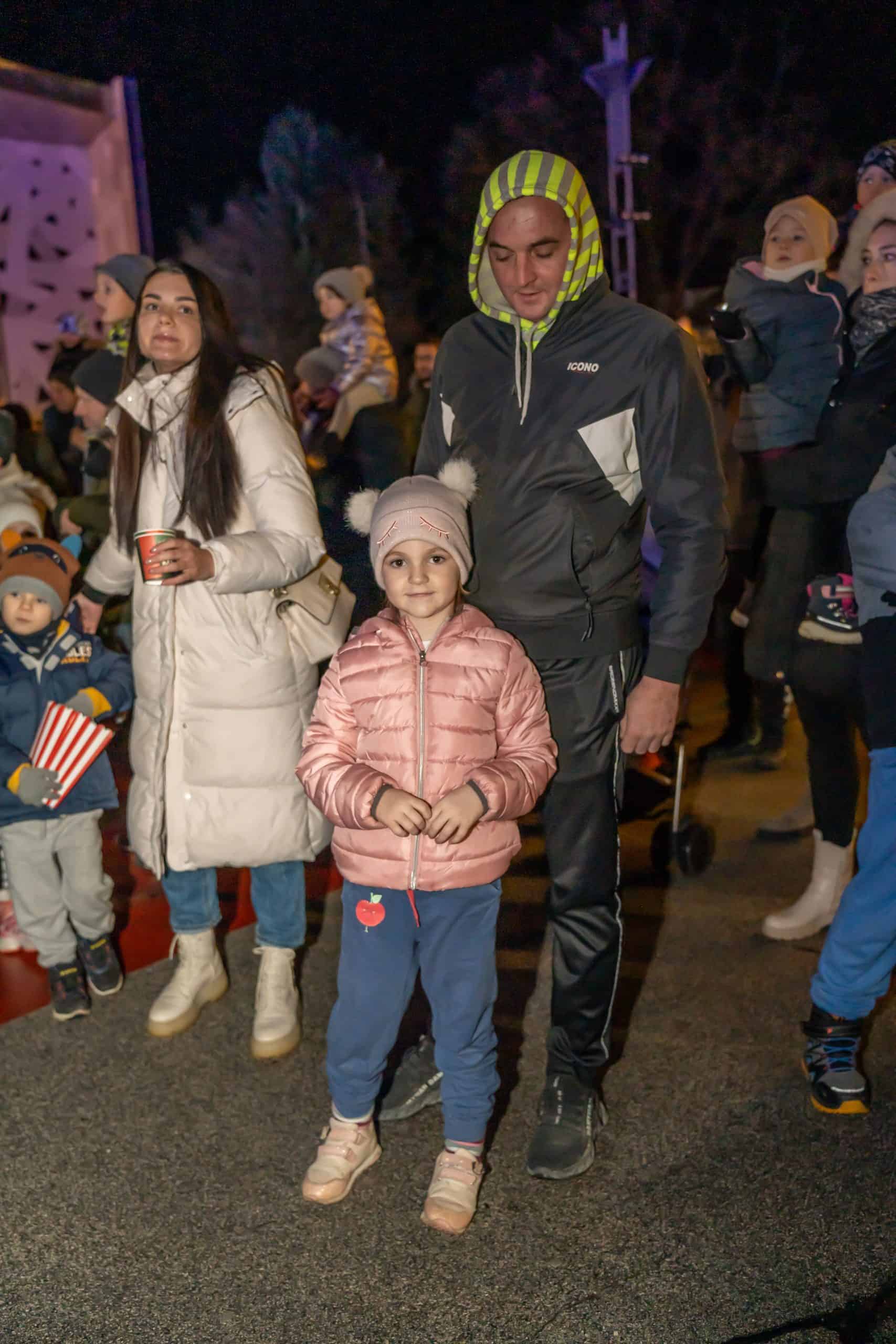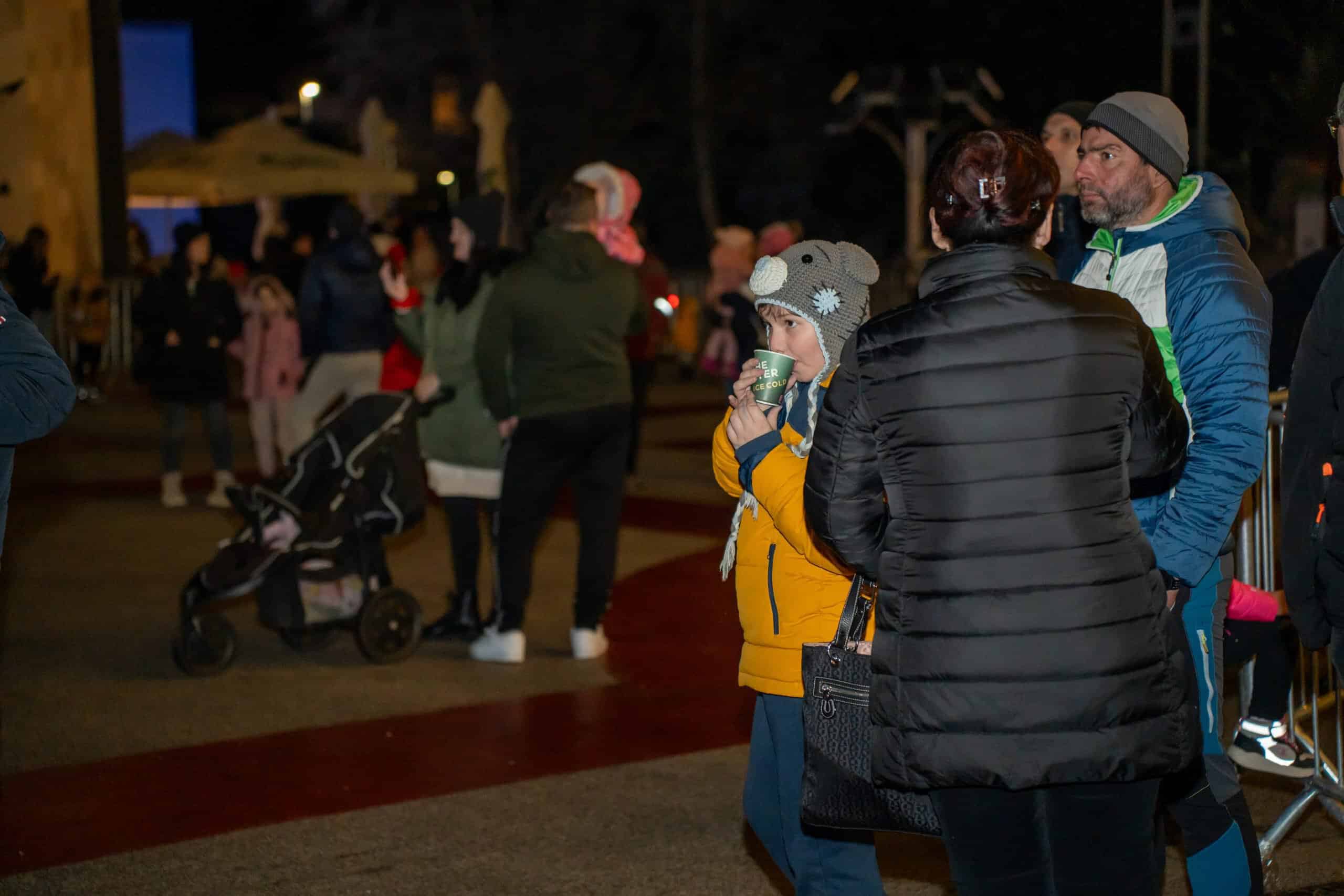 Dedek Mraz je stopil na oder in prijazno pozdravil vse prisotne. Otroci so z njim skupaj zapeli pesmi, kot so “Zima, zima bela” in “Bela snežinka”, ki so še dodatno obogatile dogodek, čeprav snega ni bilo v živo, so otroški glasovi poskrbeli za pravo zimsko vzdušje.