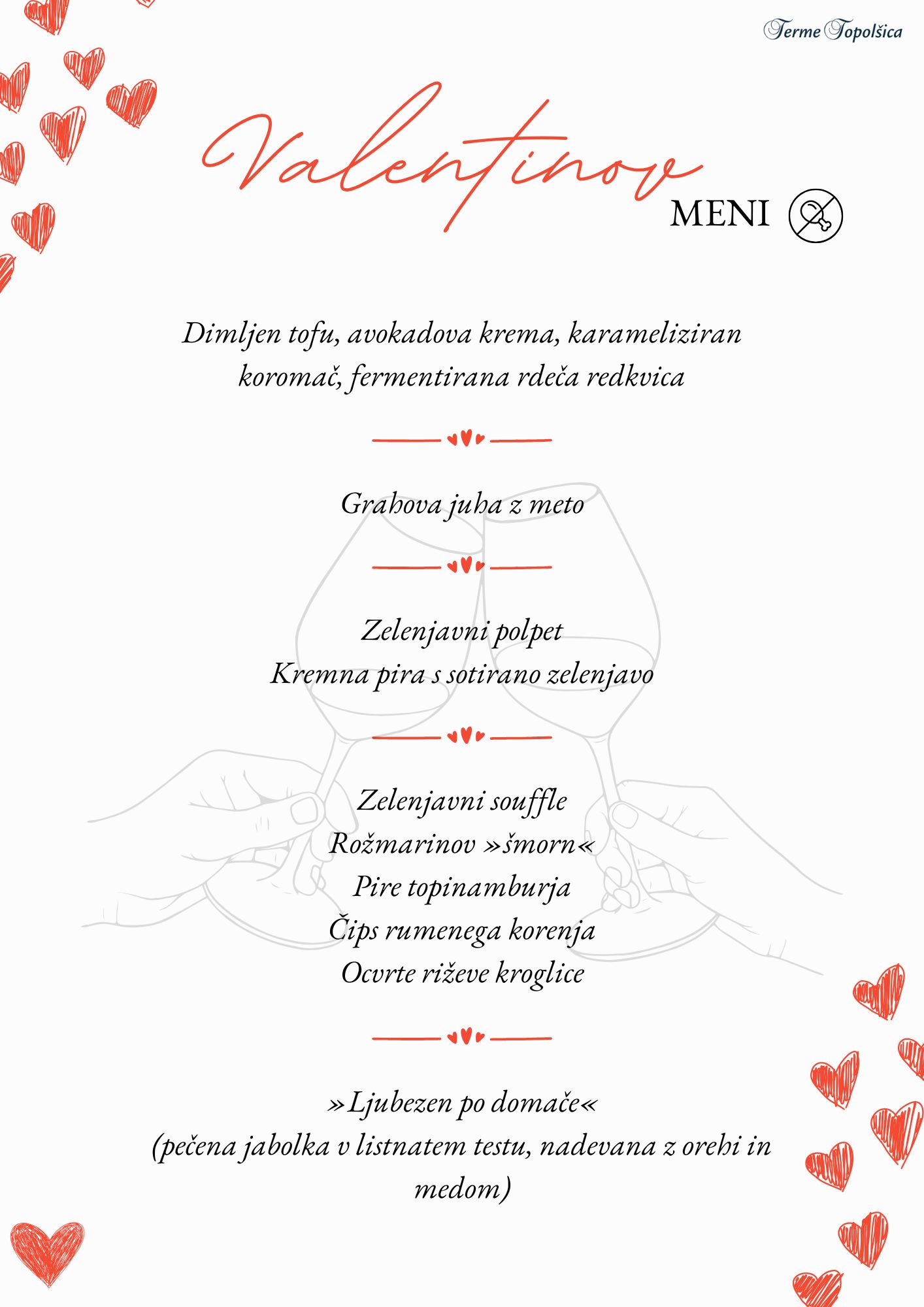 Ob tej priložnosti si lahko ogledate tudi skrbno pripravljen, okusen večhodni meni valentinove večerje, ki bo strežen v večeru dogodka (na voljo bo tudi vegetarijanska različica).