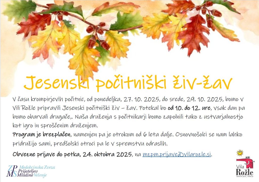 Obvezne prijave do petka, 24. oktobra 2025, na mzpm.prijave@vilarozle.si.
