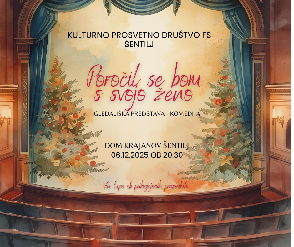• ob 20.30 uri si boste lahko v Domu krajanov Šentilj ogledali predstavo Poročil se bom s svojo ženo, zabavno gledališko predstavo, polno zapletov, zakonskih težav, vmešavanja staršev in stanovanjske stiske zakoncev.