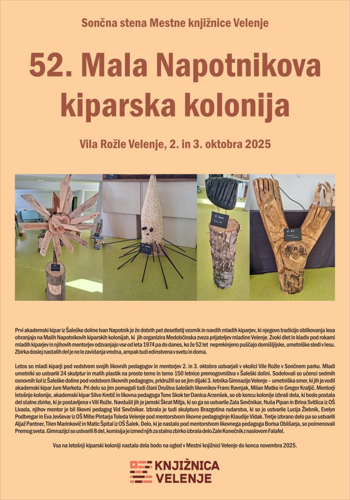 - med 8. oktobrom in 30. novembrom si lahko v velenjski knjižnici ogledate razstavo skulptur, ki so jih letos ustvarili mladi kiparji na 52. Mali Napotnikovi kiparski koloniji. Letos so učenci sedmih osnovnih šol in dijaki 3. letnika gimnazije, ustvarili 24 skulptur in malih plastik na prosto temo in temo 150-letnice premogovništva v Šaleški dolini.