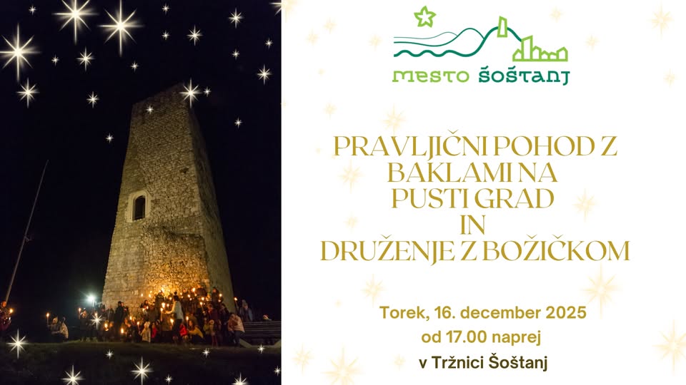 Starši in otroci, zborno mesto je pred Tržnico Šoštanj v torek, 16. decembra, ob 17. uri, kjer boste prižgali bakle in se v spremstvu gasilcev odpravili na pravljični pohod proti Pustemu gradu. Pot vas bo vodila skozi naravo, na vrhu pa vas bo pričakal čudovit razgled na praznično okrašeno mesto Šoštanj.