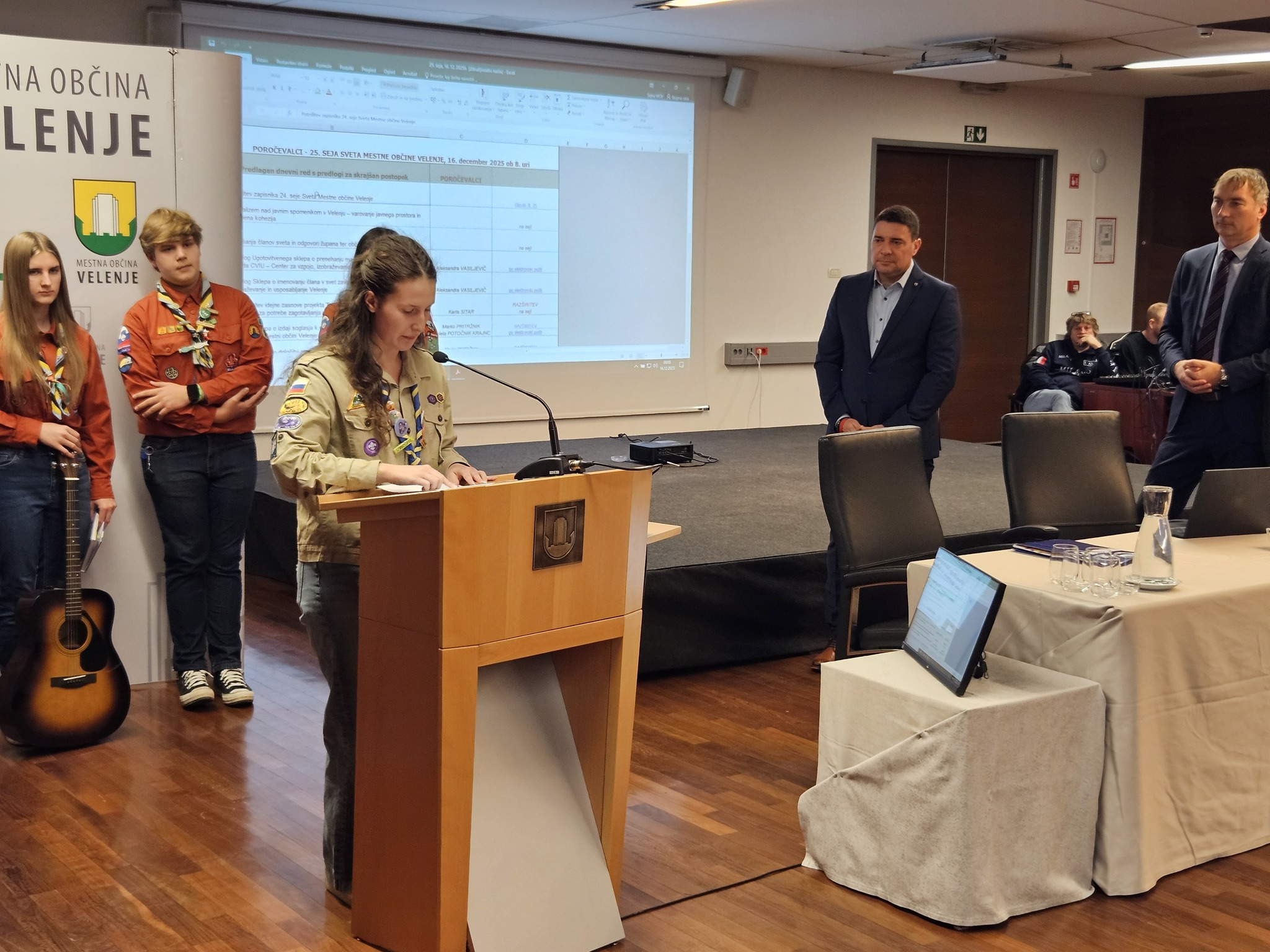 Skavti in taborniki so pred začetkom seje Sveta Mestne občine Velenje svetnike nagovorili ter prebrali poslanico. Letošnje geslo Kaj ti v resnici želim za Božič? nas v prazničnem vrvežu vabi k razmisleku o tem, kaj je zares pomembno.