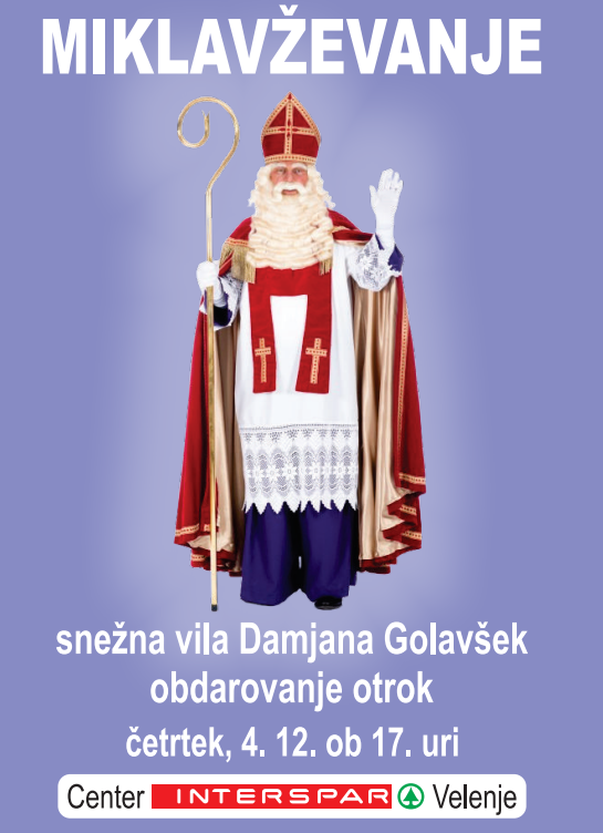 Ta četrtek, 4. decembra, ob 17. uri v Center Interspar Velenje prihaja Miklavž. Prvega dobrega moža, ki prinaša pooooln koš sladkih darilc za vse otroke, bodo priklicali z glasbo. Najmlajše bo razveseljevala snežna vila, Damjana Golavšek.