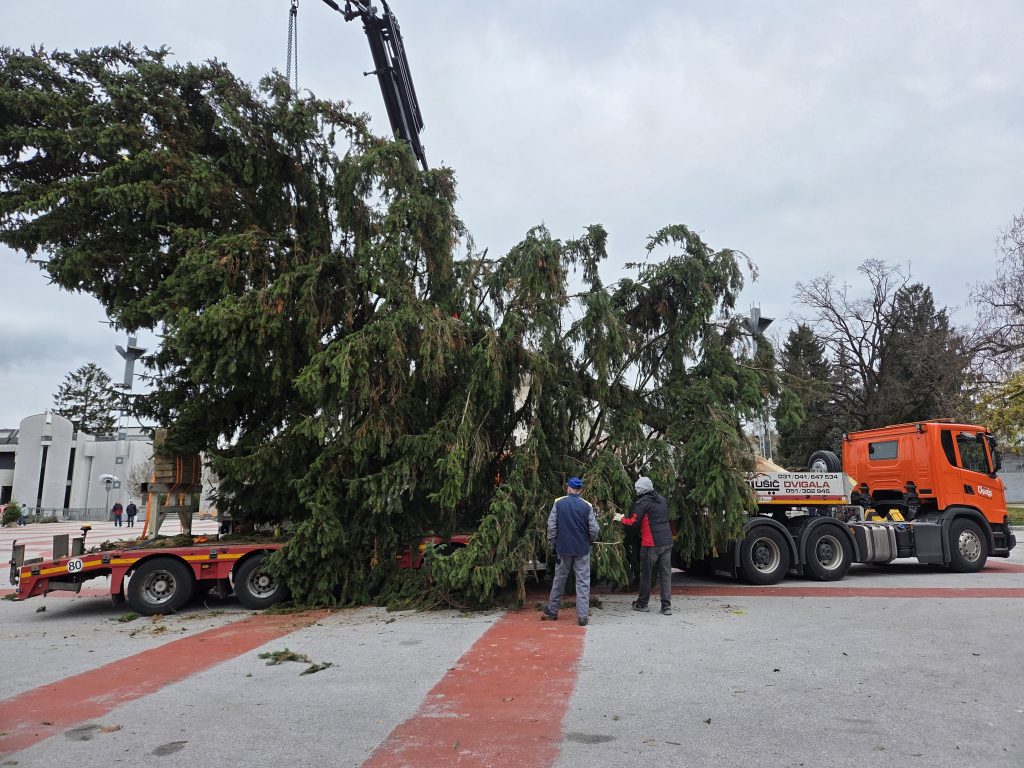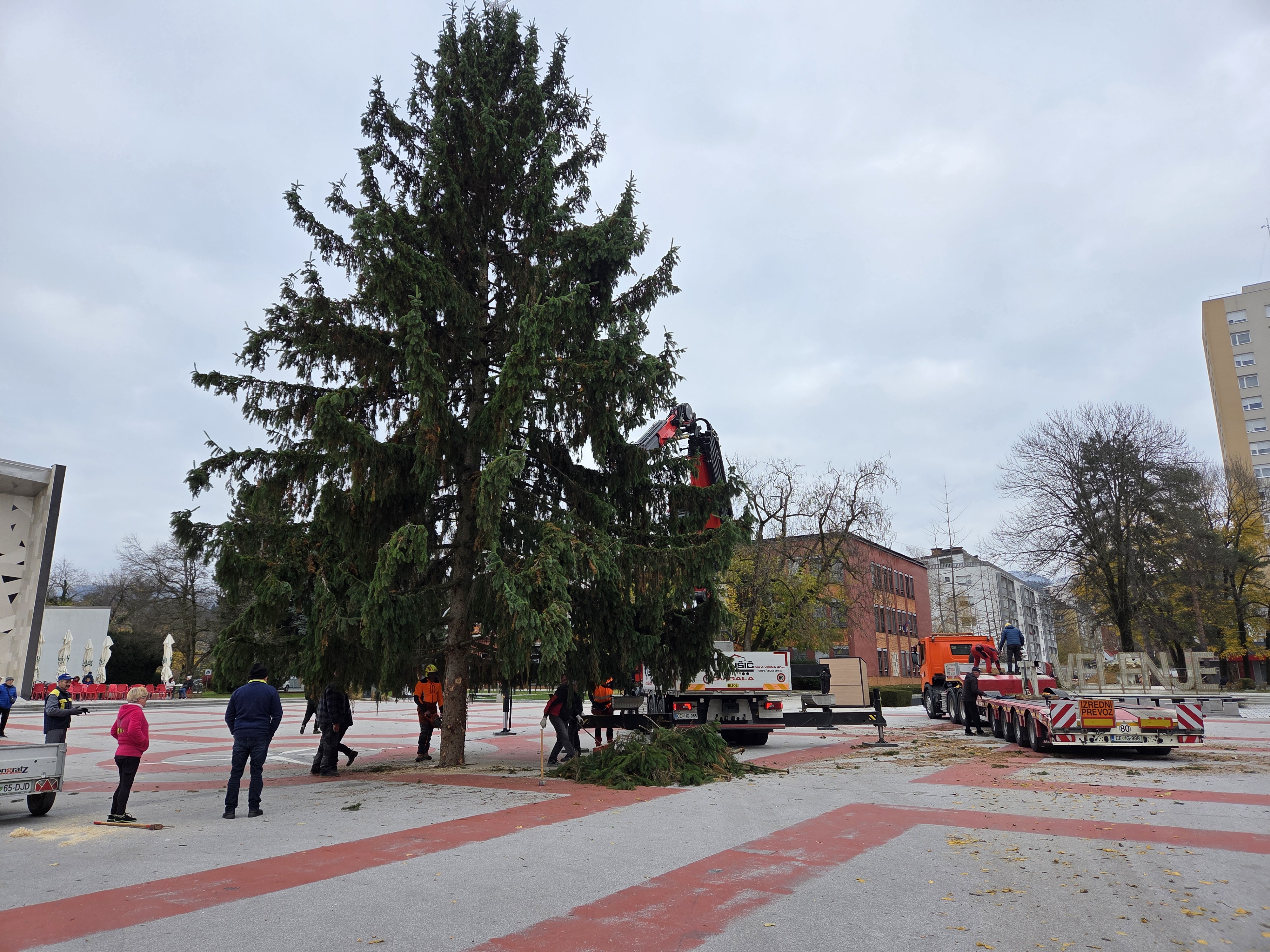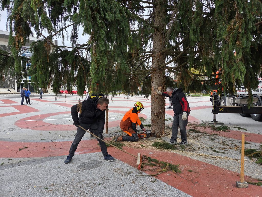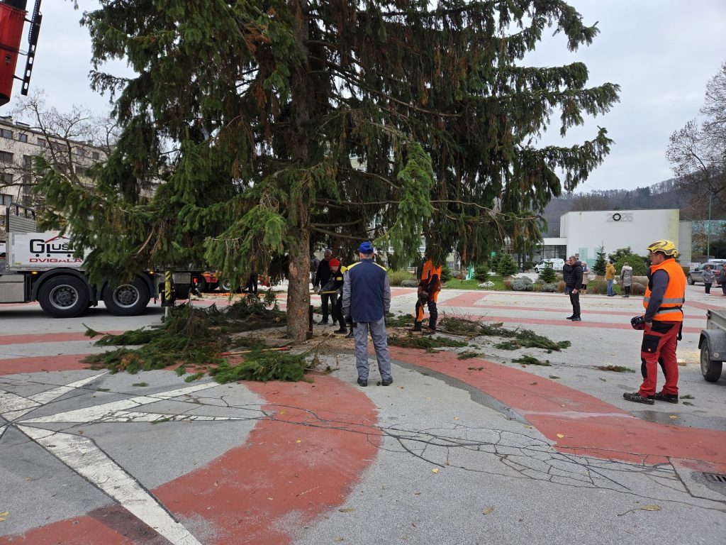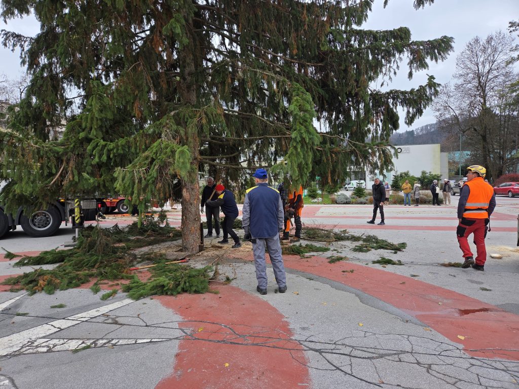 Na Titovem trgu so danes dopoldne postavili novoletno smreko, ki bo v praznični podobi zažarela v nedeljo, 30. novembra.
