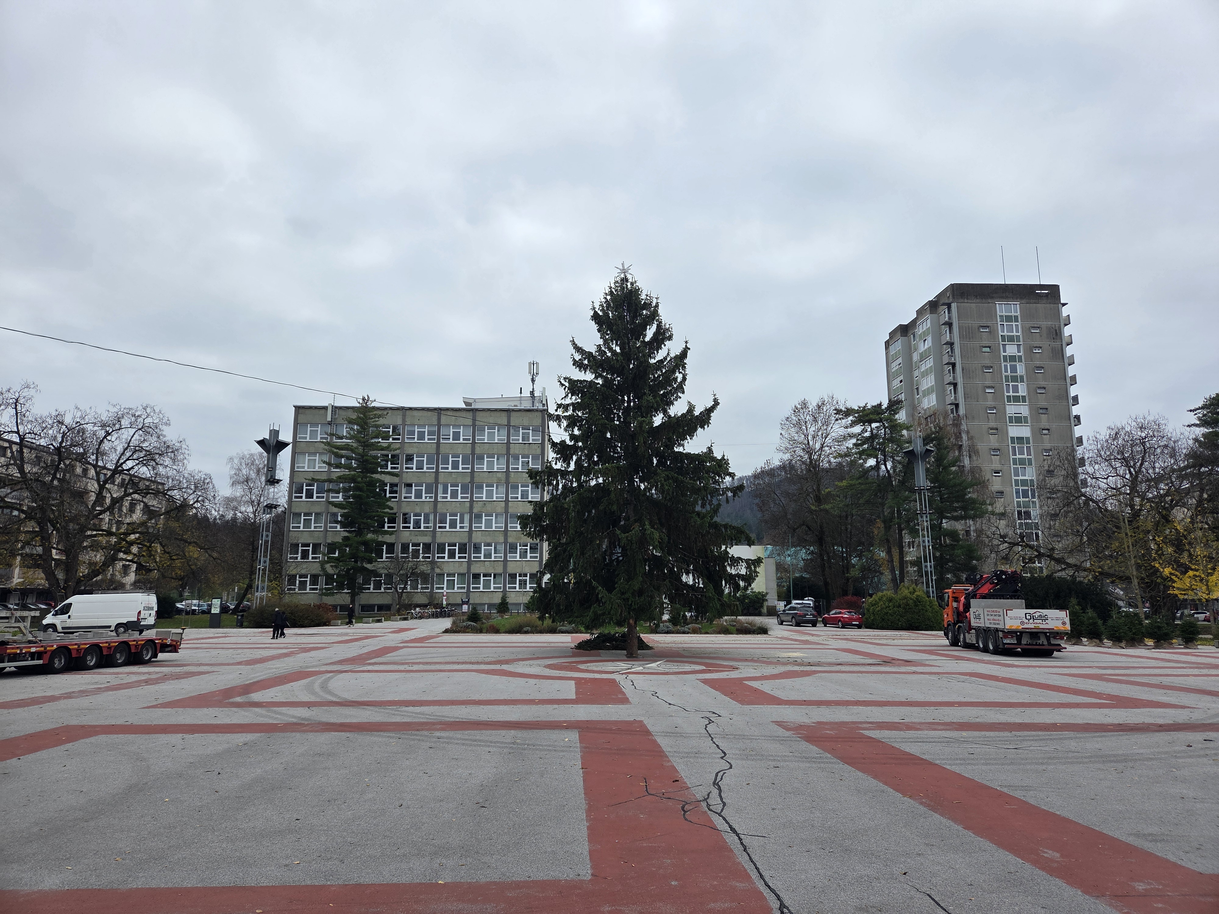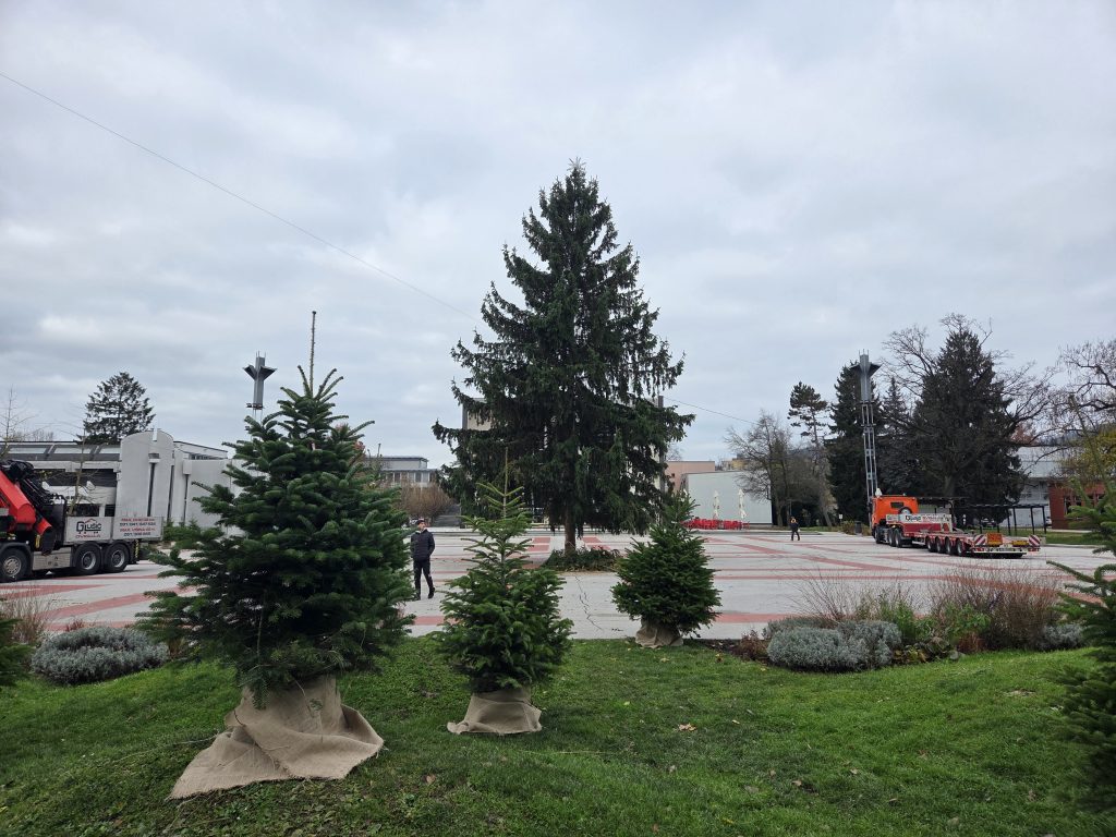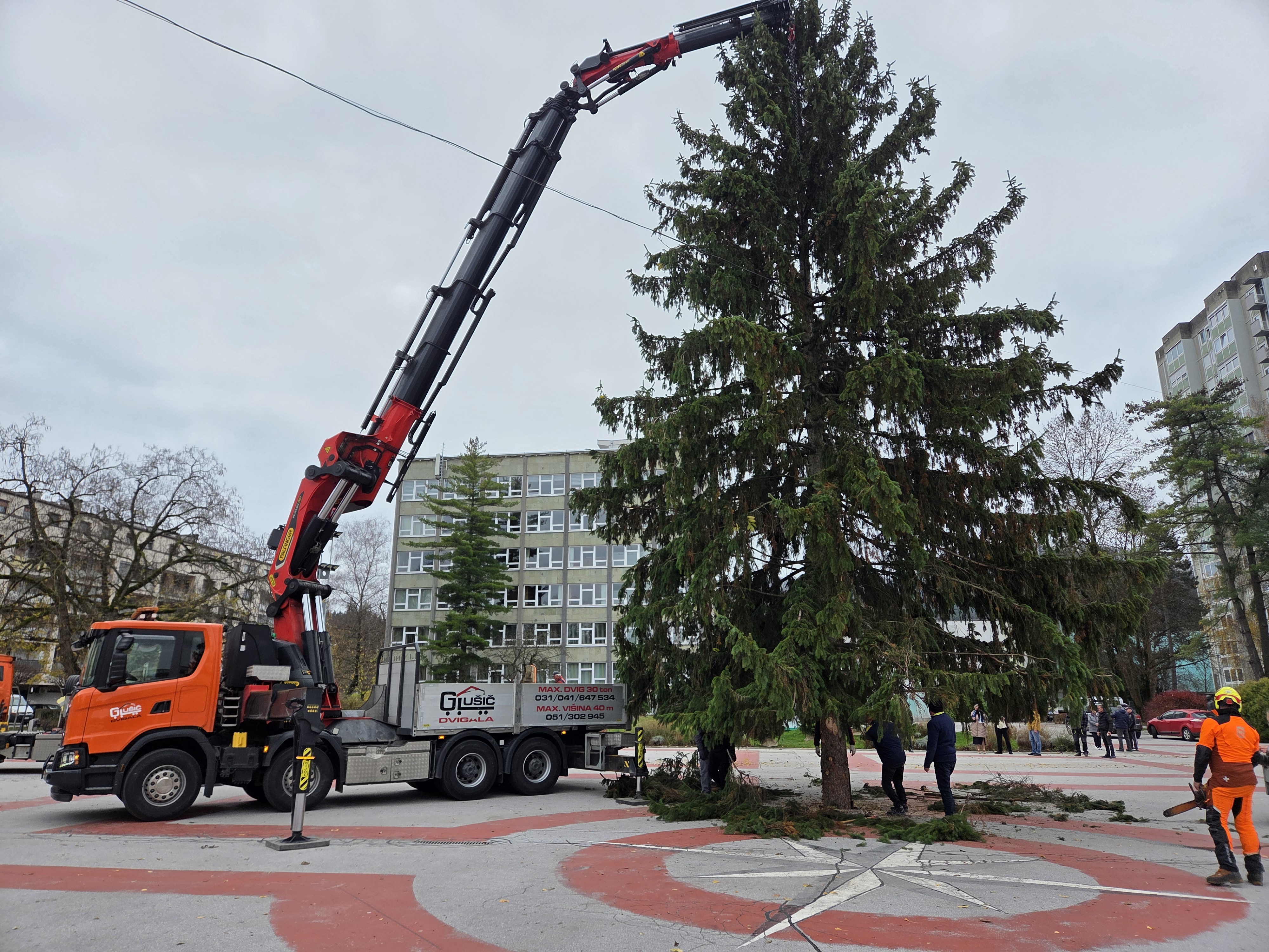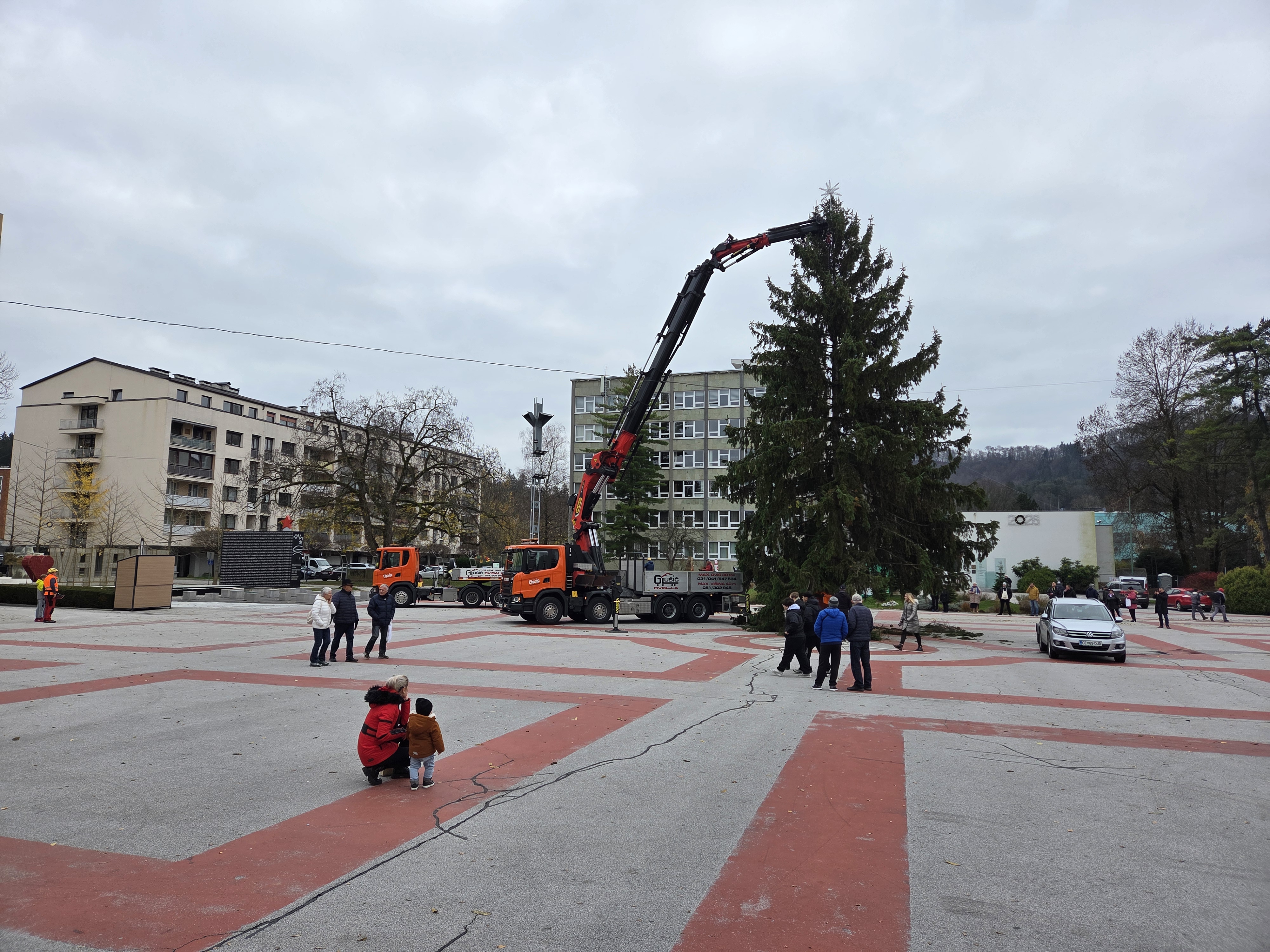 Na Titovem trgu so danes dopoldne postavili novoletno smreko, ki bo v praznični podobi zažarela v nedeljo, 30. novembra.