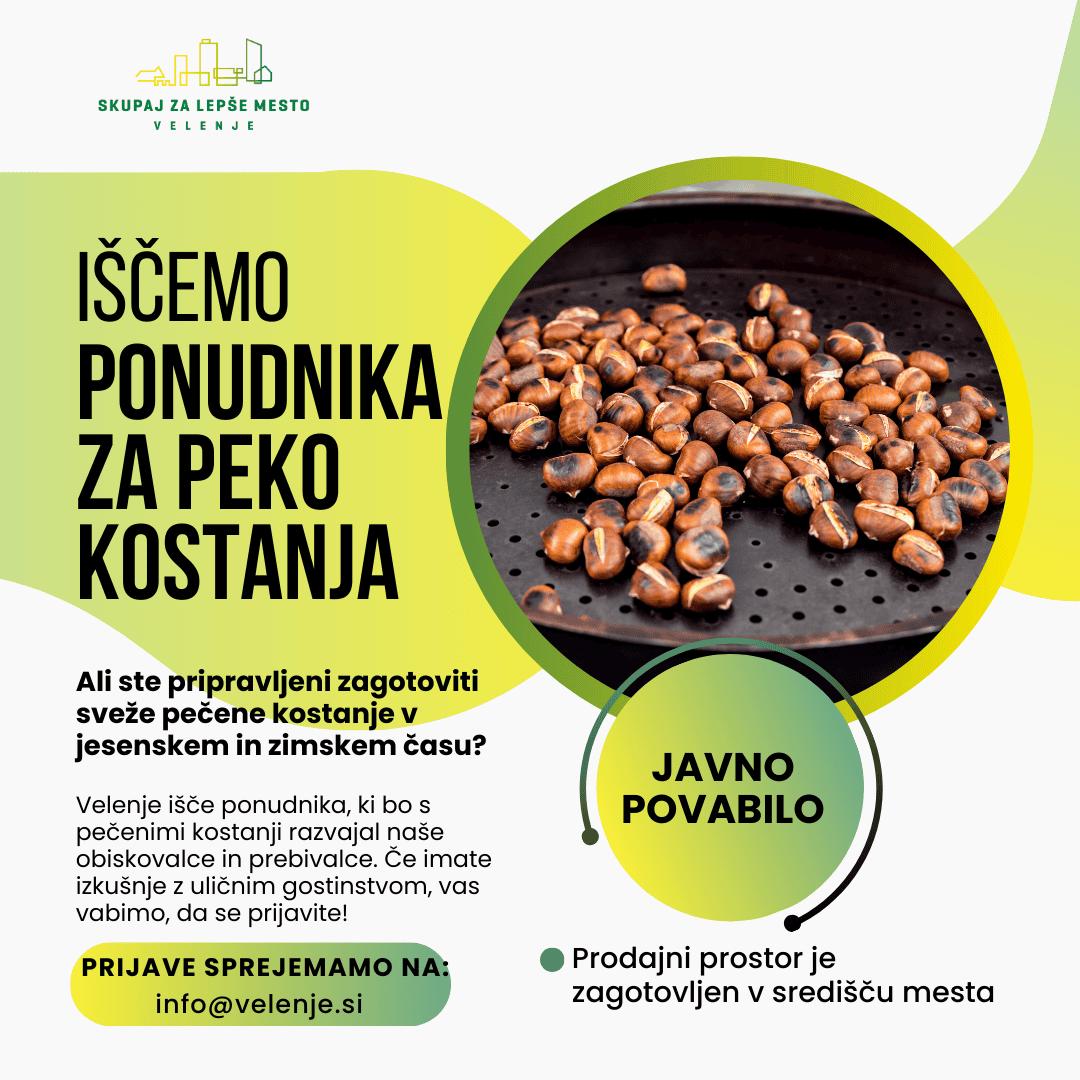 Mestna občina Velenje je objavila javno povabilo za ponudnika, ki bo v središču mesta občane in obiskovalce razvajal s pečenim kostanjem. Če imate izkušnje z uličnim gostinstvom, vabljeni, da se prijavite na info@velenje.si.