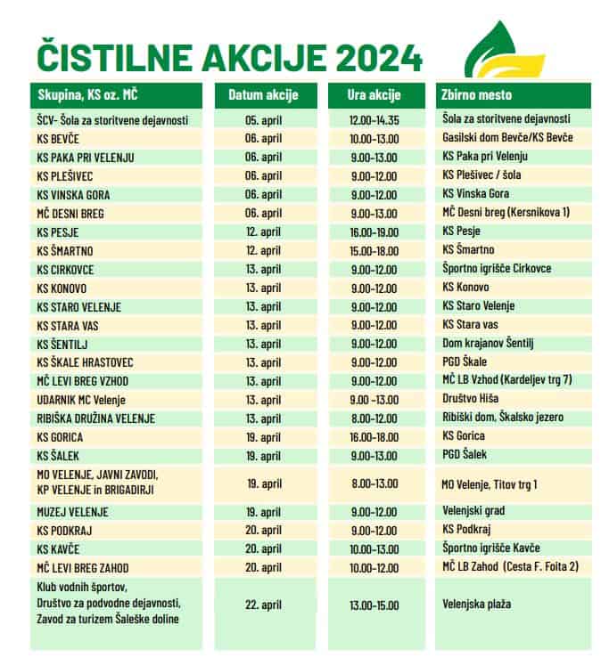 Vsako leto številni prostovoljci, po katerih je naša občina poznana, sodelujejo v čistilnih akcijah. Čistilne akcije bodo potekale od 6. aprila, ko zaznamujemo dan za spremembe, pa vse do 22. aprila, ko je svetovni dan Zemlje. K sodelovanju vabijo vse občanke in občane, da se pridružijo akciji na območju, kjer imajo dom ali preživljajo prosti čas. Sodelovanje je prostovoljno, vsi udeleženci prejmejo zaščitne rokavice in vrečke za odpadke. Razpored je objavljen v priloženi tabeli. Zbirno mesto je pred sedeži vseh krajevnih skupnosti, mestnih četrti oz. kot je navedeno v tabeli. Zbrani odpadki se odlagajo v kesone na lokaciji zbirnega mesta in bodo kasneje odpeljani v Zbirni center Velenje ob Škalskem jezeru. Člani lovskih družin, gasilskih društev, športne organizacije, taborniki in druge zainteresirane organizacije ali podjetja naj se čistilni akciji pridružijo na območju, kjer delujejo oz. imajo sedež, prostore. Zaposleni na Mestni občini Velenje, javnih zavodih in Komunalnem podjetju Velenje bodo čistili mestne vpadnice v petek, 19. aprila, dopoldan. Zbirno mesto je ob 8. uri na parkirišču za občino. Pridružili se jim bodo tudi udarniki in drugi prostovoljci. Spomladansko čiščenje bodo zaključili s čistilno akcijo na Velenjski plaži, ki bo potekala v ponedeljek, 22. aprila, ob pomoči članov iz Kluba vodnih športov Velenje, Zavoda za turizem Šaleške doline in ob pomoči potapljačev iz Društva za podvodne dejavnosti Velenje.