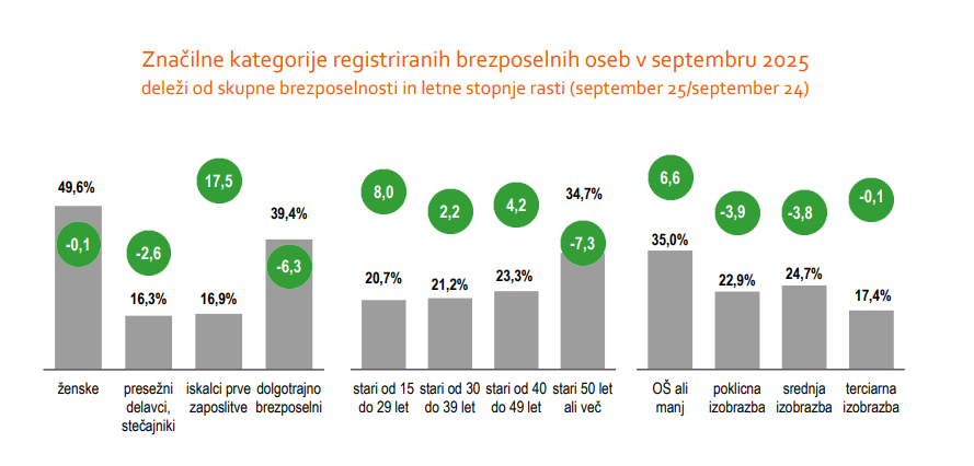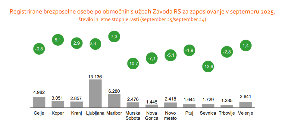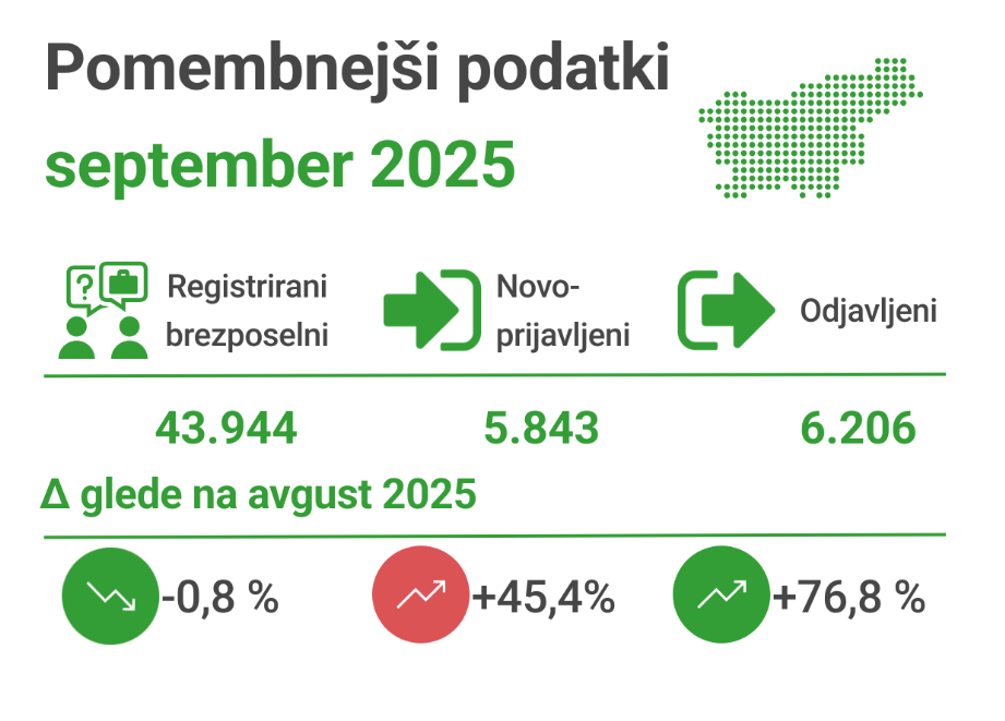 Ob koncu septembra 2025 je bilo v Sloveniji registriranih 43.944 brezposelnih oseb, kar je 363 manj kot mesec prej. V primerjavi s septembrom 2024, pa se je na Zavod prijavilo 97 oseb več.