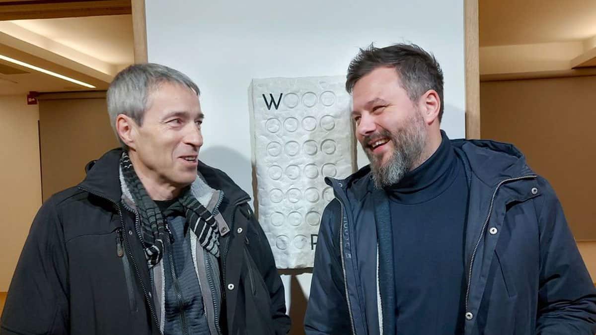 Podelitev naziva kultrni ustvarjalec leta. Levo župan MO Velenje Peter Dermol, desno prejemnik Stane Špegel.