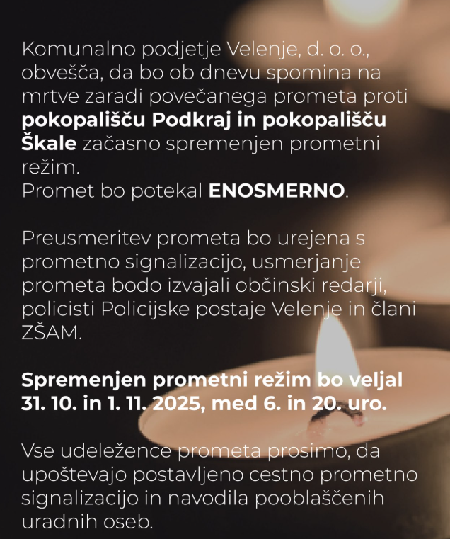 Komunalno podjetje Velenje, d. o. o., obvešča, da bo ob dnevu spomina na mrtve zaradi povečanega prometa proti pokopališču Podkraj in pokopališču Škale začasno spremenjen prometni režim. Promet bo potekal enosmerno.