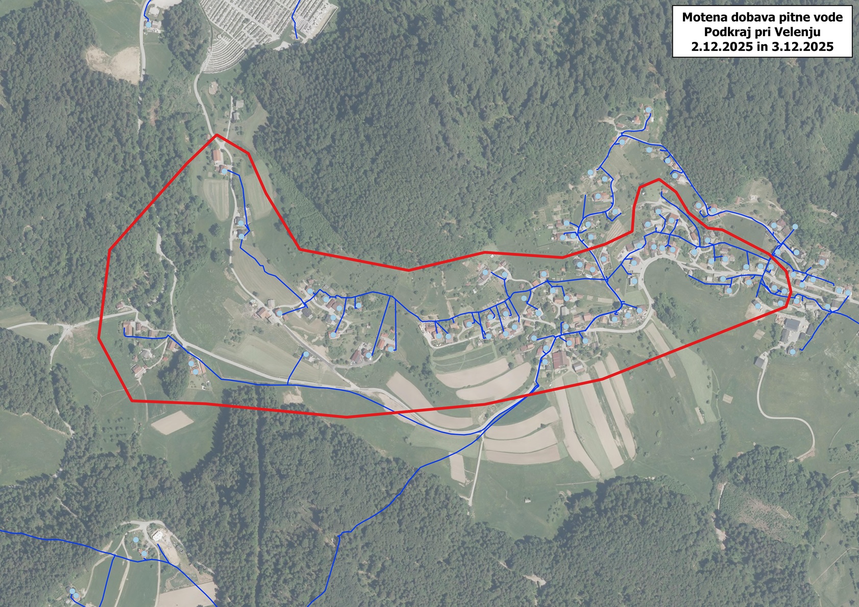 Komunalno podjetje Velenje obvešča uporabnike v naselju Podkraj pri Velenju, da bo v delu naselja, označenem na sliki spodaj, v torek in v sredo, 3. in 4. decembra, med 8. in 15. uro prekinjena oziroma motena dobava pitne vode zaradi nujnih vzdrževalnih del na javnem vodovodu.
