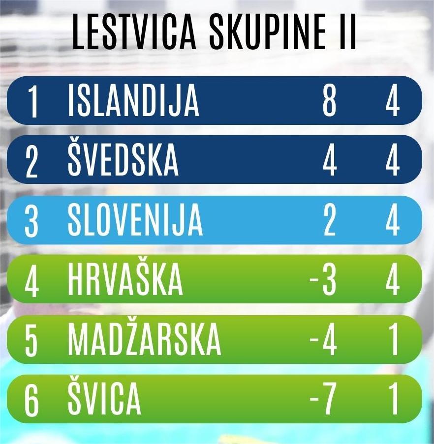 Slovenci imajo na drugem mestu skupine II na računu štiri točke. Do konca drugega dela jih čakata še dve tekmi. V torek se bodo ob 18. uri pomerili s Hrvati, manj kot 24 ur kasneje, ob 15.30 pa še z Islandci.