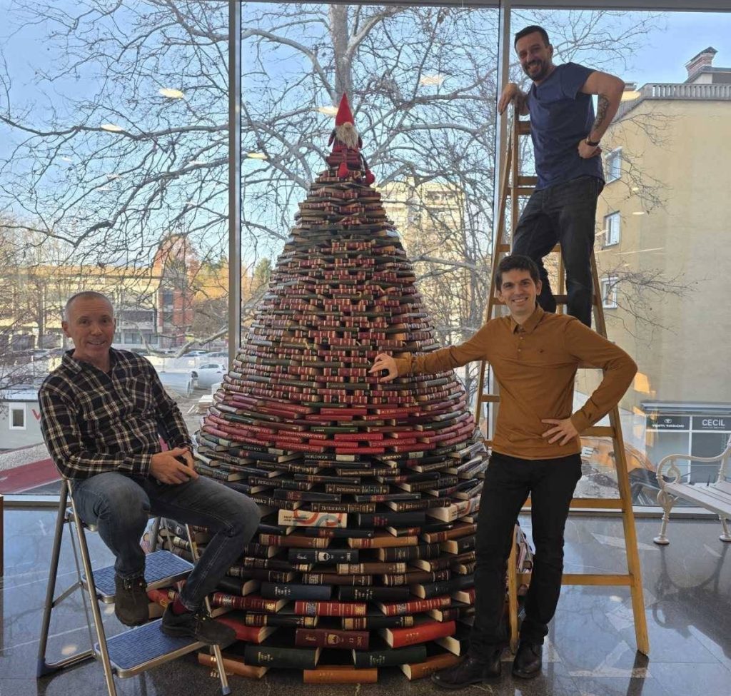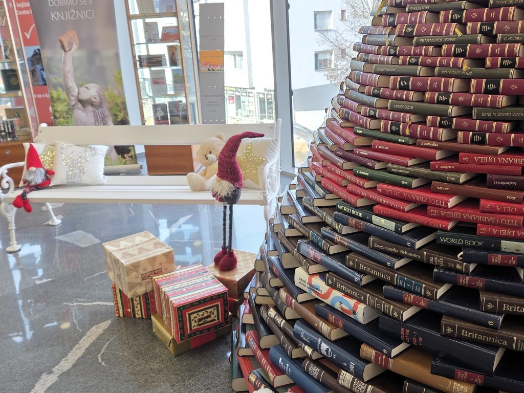 Trije prijazni knjižni škrati so tudi letos v preddverju Knjižnice Velenje postavili knjižno smrečico. Letos je še višja, večja in bogatejša.