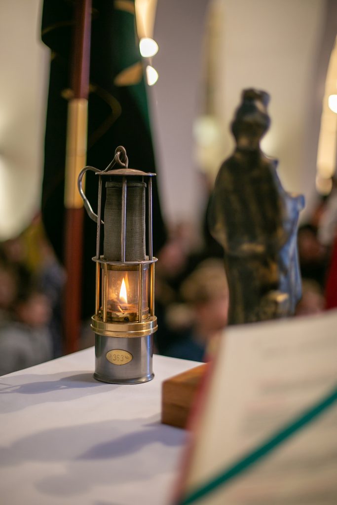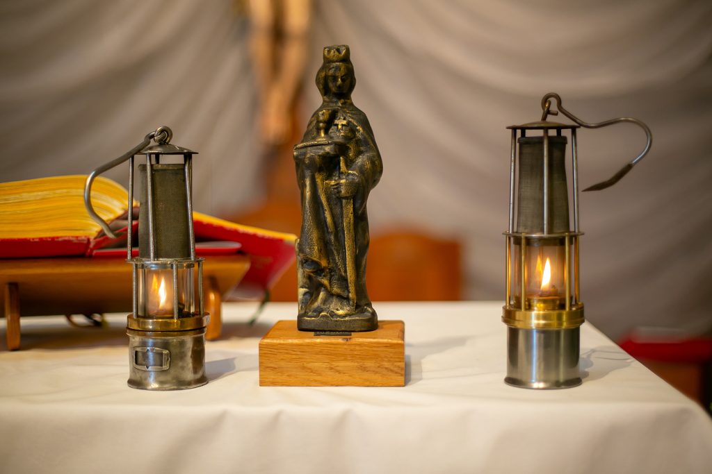 Ob slovesnem vstopu v cerkev so komandant rudarske parade Boris Sotler,upokojeni tehnični direktor Bogdan Makovšek, upokojeni rudar Alojz Landeker in ravnatelj Šole za strojništvo, geotehniko in okolje Peter Rozman na oltar prinesli zunanje simbole slovesnosti: prapor, kip zavetnice sv. Barbare in rudarski svetilki.